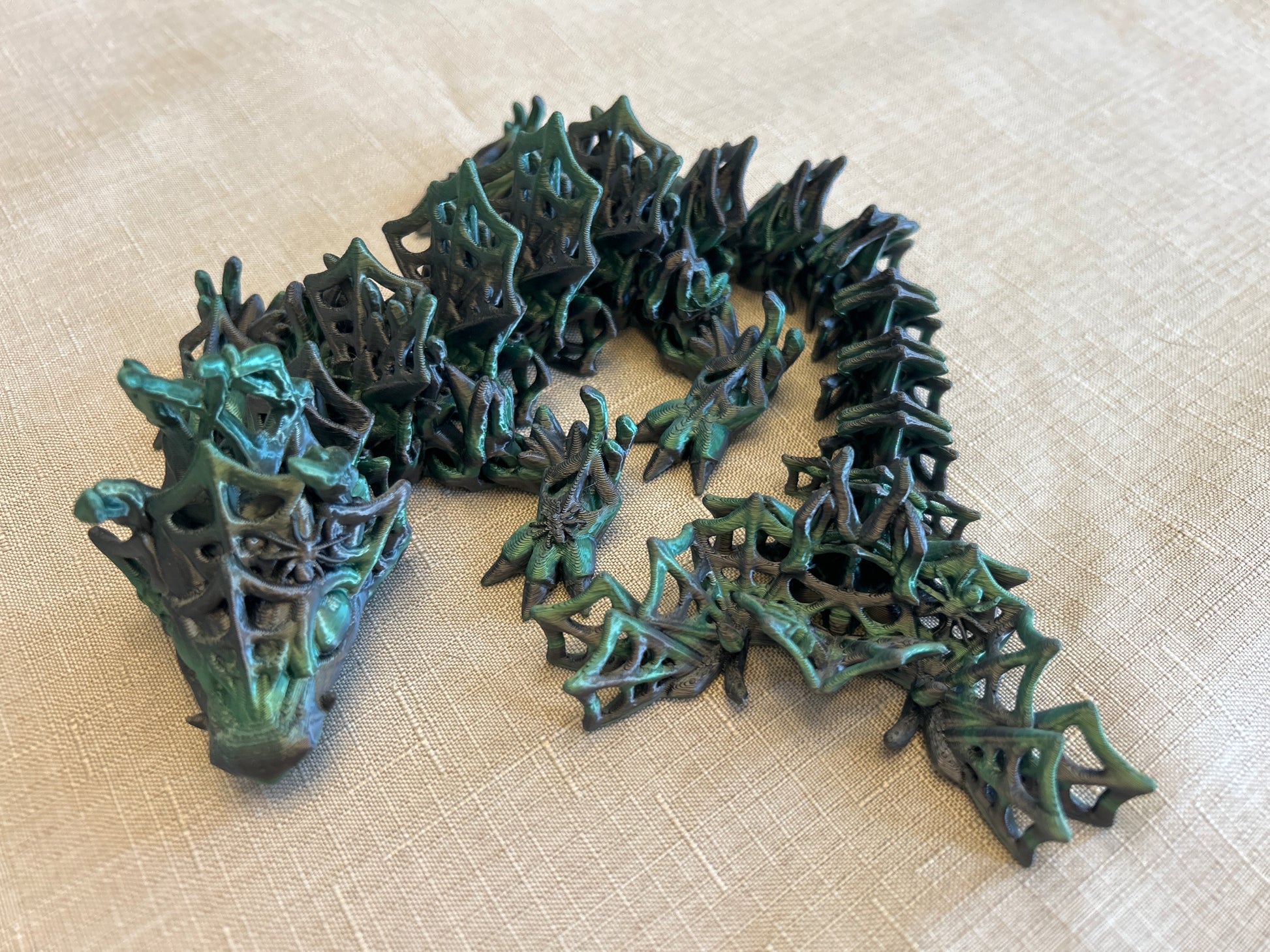 This dragon is very unique. Made with dark green and black filament. It makes a great gift, toy and decoration!